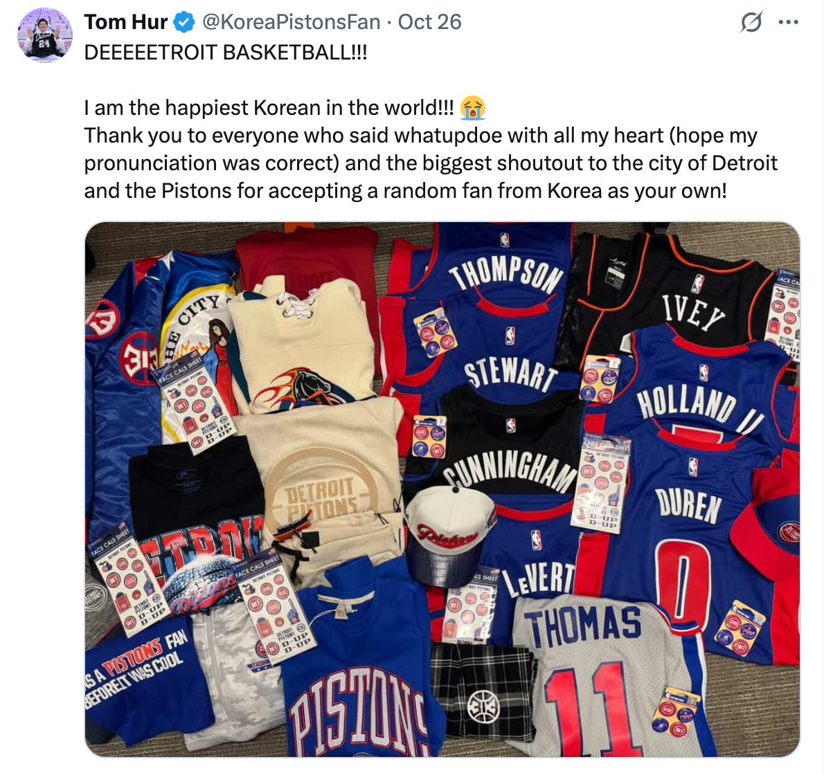 “I was geeking out because you cannot find Pistons gear in Korea, like, anywhere,” he says. “I shopped the hell out of the store.”